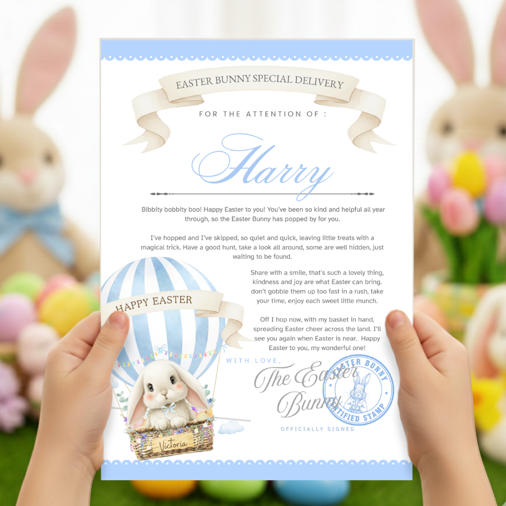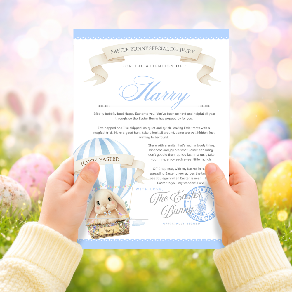 Printed range - A4 Easter balloon bunny blue special delivery certificate