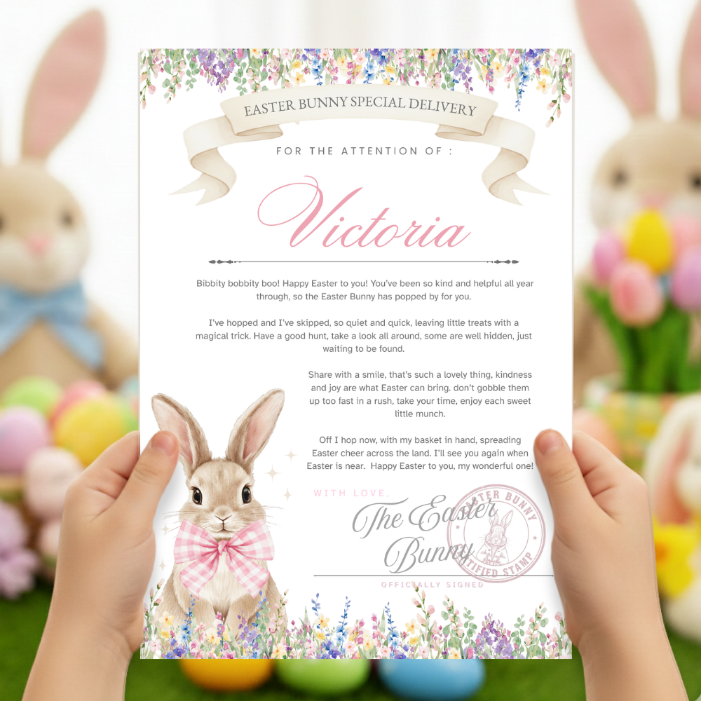 Printed range - A4 Easter toile bunny pink ribbon special delivery certificate