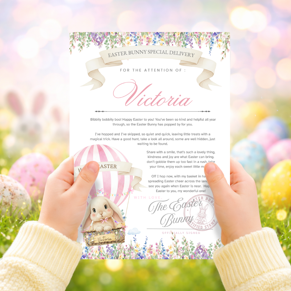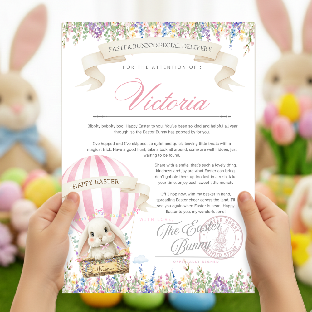 Printed range - A4 Easter balloon bunny pink special delivery certificate
