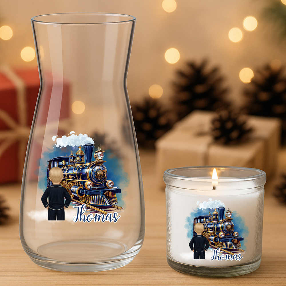 A boy stares at the train in winter - Personalized - Christmas UV DTF Decal