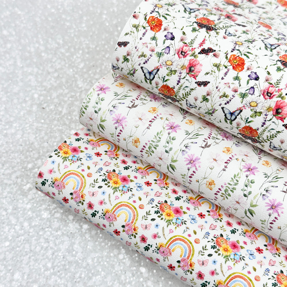 Wild flower Floral rainbow butterfly - Pu Leatherette vinyl - canvas - choose Fabric material Sheets